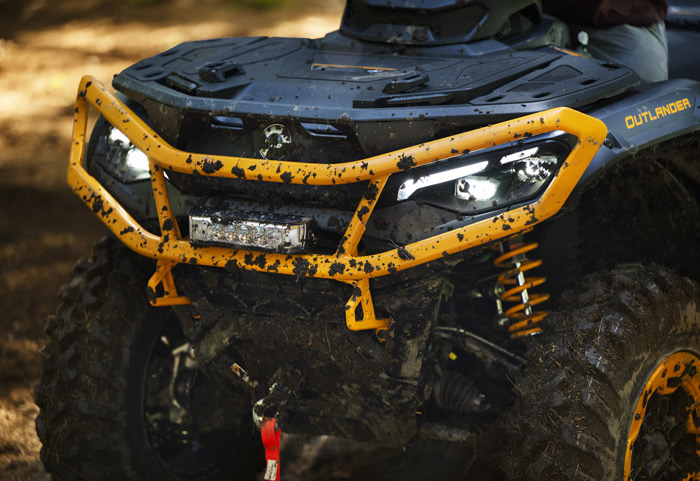 Equipado com amortecedores dianteiros e traseiro Fox 1.5 Podium QS3, direção dinâmica assistida de modo triplo (DPS), guincho com capacidade para 1.588 kg (3.500 lb), diferencial dianteiro autoblocante Visco-4Lok, para-choques dianteiros e traseiros reforçados, rodas de alumínio fundido de 14 polegadas com pneus Maxxis Bighorn 2.0 de 27 polegadas, defletores de vento no guidão, mostrador digital multifunção de 7,6 polegadas e muito mais.